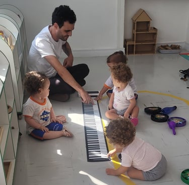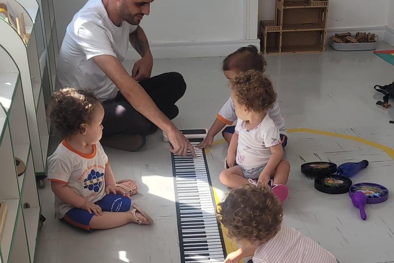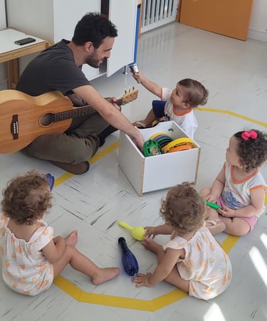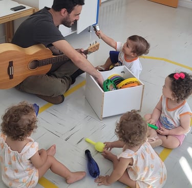 Por meio da musicalização incentivamos a escuta atenta, o desenvolvimento da fala, a ampliação do pensamento criativo e a imaginação, contribuindo para o crescimento pessoal e educacional na primeira infância.